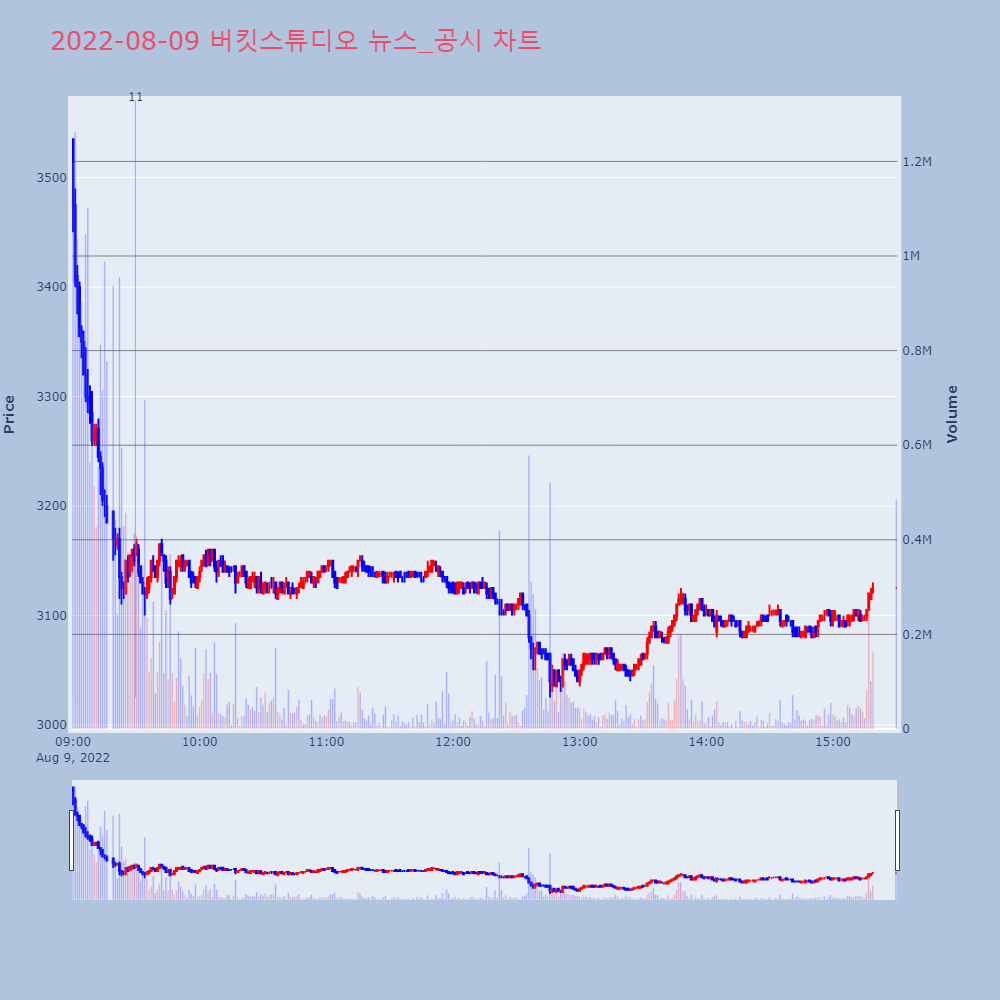 11 | [특징주] 버킷스튜디오, 유상증자 하루 만에 반락…장 초반 9%대 약세코스닥 상장사 버킷스튜디오가 개장 직후 11% 급락하 | 조선경제 | 버킷스튜디오 | 2022-08-09 09:29:31 |