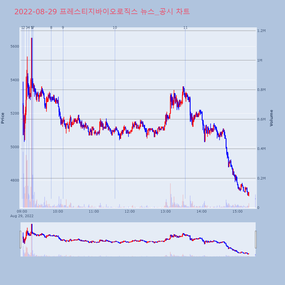 | 7 | [특징주] 프레스티지바이오로직스, 대표이사 변경 소식에 '급등' 제목 : [특징주] 프레스티지바이오로직스, 대표이사 변 | 인포스탁 | 프레스티지바이오로직스 | 2022-08-29 09:19:03 |