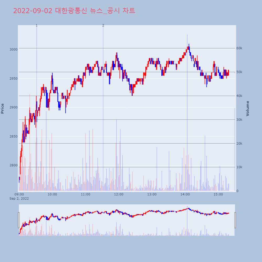 | 2 | [장중수급포착] 대한광통신, 외국인/기관 동시 순매수… 주가 +9.39% [서울=뉴스핌] 로보뉴스 = 02일 11시 30분 현재 | 뉴스핌 | 대한광통신 | 2022-09-02 11:31:55 |