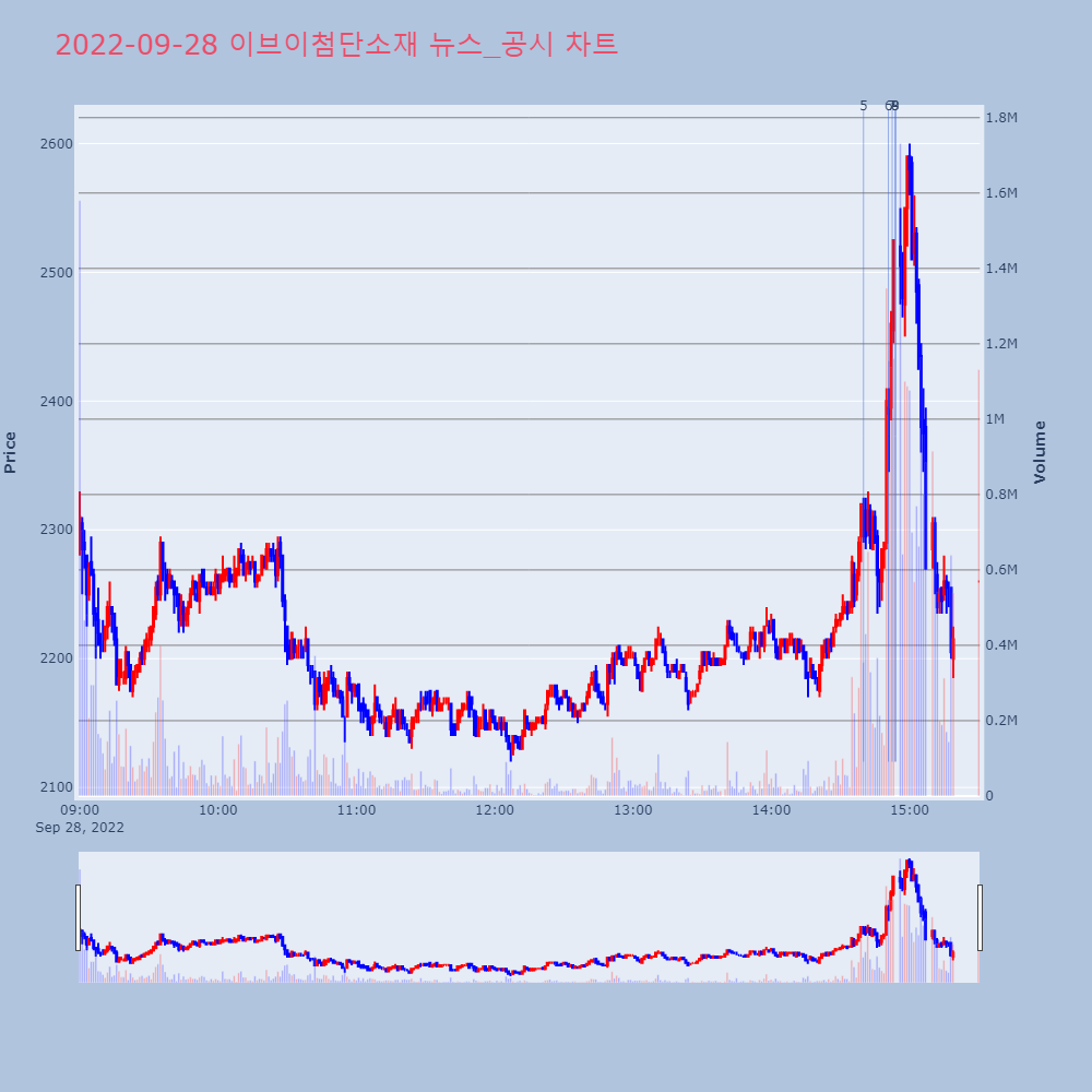 | 3 | 이브이첨단소재, -4.62% VI 발동이브이첨단소재가 VI가 발동했다. 전일 대비 4.62% | 조선경제 | 이브이첨단소재 | 2022-09-27 10:47:05 |