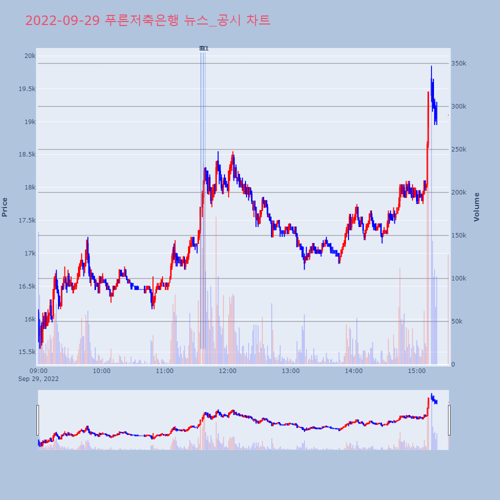 | 2 | 푸른저축은행, +13.73% VI 발동푸른저축은행이 VI가 발동했다. 전일 대비 13.73% | 조선경제 | 푸른저축은행 | 2022-09-28 11:13:39 |
