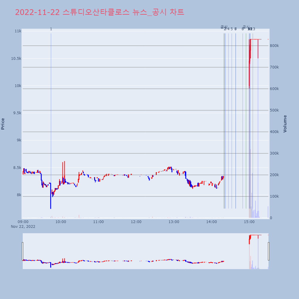 | 10 | 스튜디오산타클로스, +29.63% 상한가스튜디오산타클로스가 상한가를 기록했다. 전일 대비 29 | 조선경제 | 스튜디오산타클로스 | 2022-11-22 15:00:48 |
