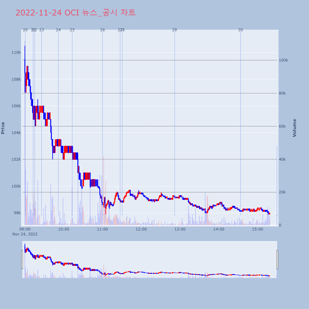 | 26 | OCI, -5.19% VI 발동OCI가 VI가 발동했다. 전일 대비 5.19% 하락한 | 조선경제 | OCI | 2022-11-24 11:00:13 |