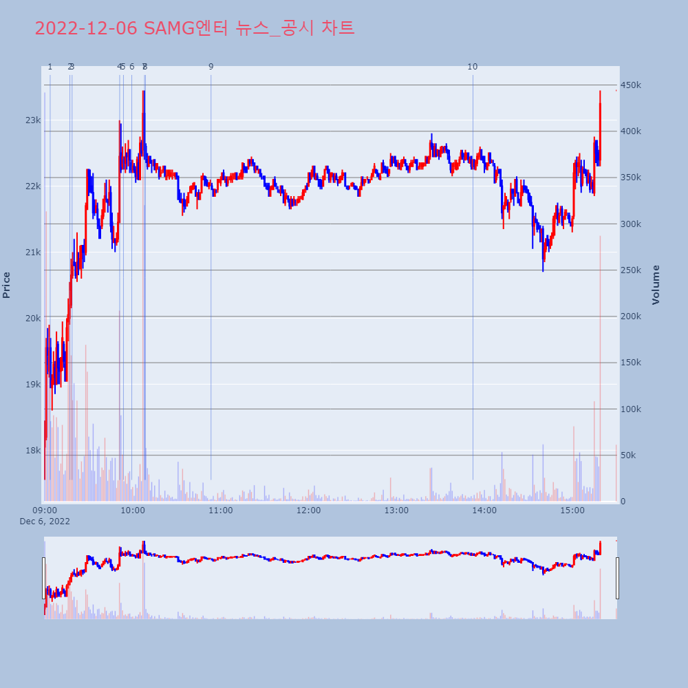 | 9 | [특징주] SAMG엔터, 코스닥 상장 첫 날부터 주가 '초강세' 제목 : [특징주] SAMG엔터, 코스닥 상장 첫 날부 | 인포스탁 | SAMG엔터 | 2022-12-06 10:53:28 |