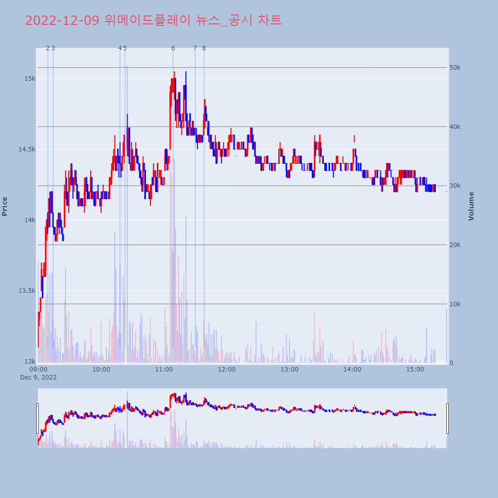 | 5 | 위메이드플레이, +8.96% VI 발동위메이드플레이가 VI가 발동했다. 전일 대비 8.96% | 조선경제 | 위메이드플레이 | 2022-12-09 10:22:48 |