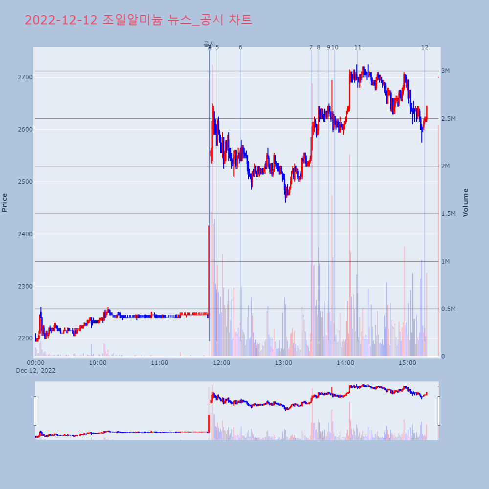 | 3 | 조일알미늄, +11.29% VI 발동조일알미늄이 VI가 발동했다. 전일 대비 11.29% | 조선경제 | 조일알미늄 | 2022-12-12 11:48:33 |