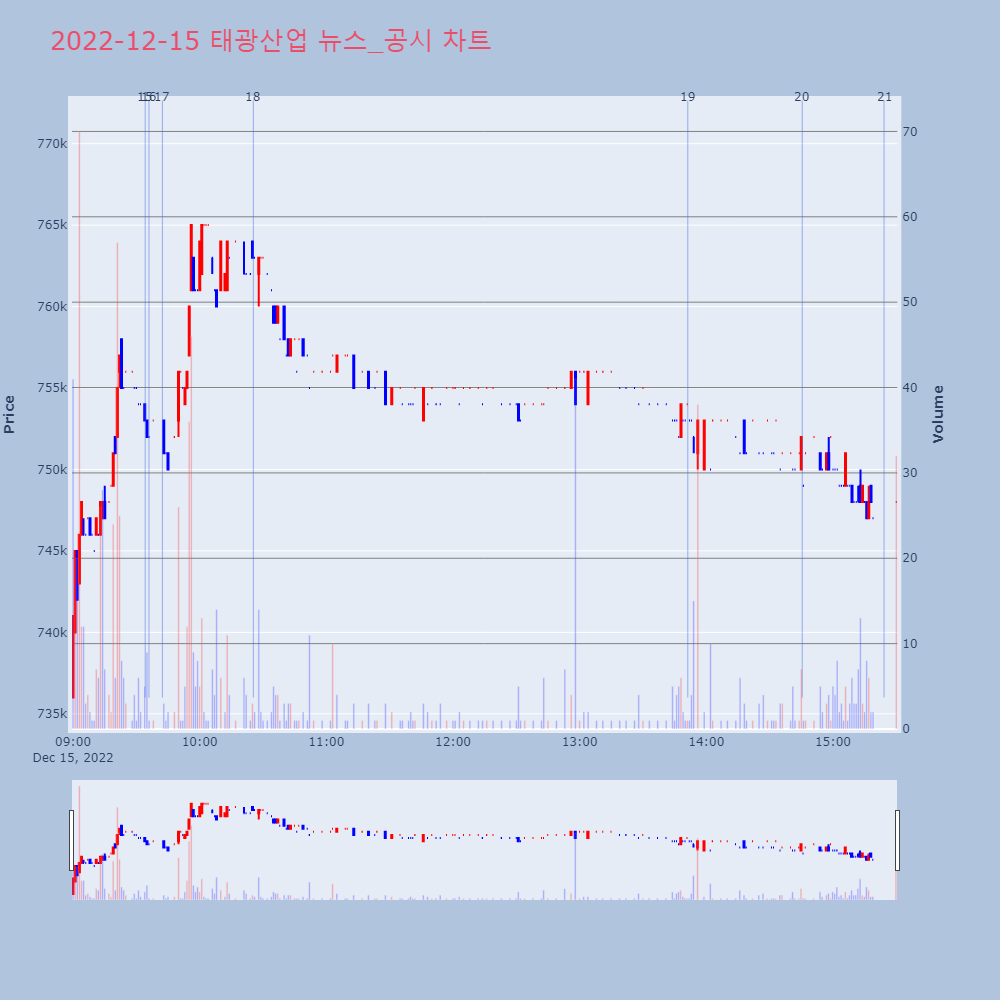 | 21 | [특징주] 태광산업, 3%대 강세...흥국생명 증자참여 철회 제목 : [특징주] 태광산업, 3%대 강세...흥국생명 | 인포스탁 | 태광산업 | 2022-12-15 15:24:13 |