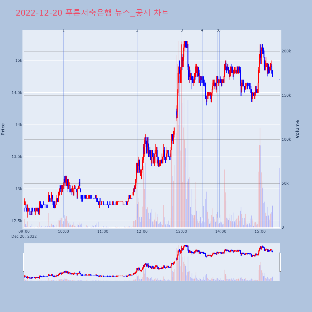 4 | [장중수급포착] 푸른저축은행, 외국인 23,313주 대량 순매수... 주가 +17.1[서울=뉴스핌] 로보뉴스 = 20일 13시 30분 현재 | 뉴스핌 | 푸른저축은행 | 2022-12-20 13:31:52 |