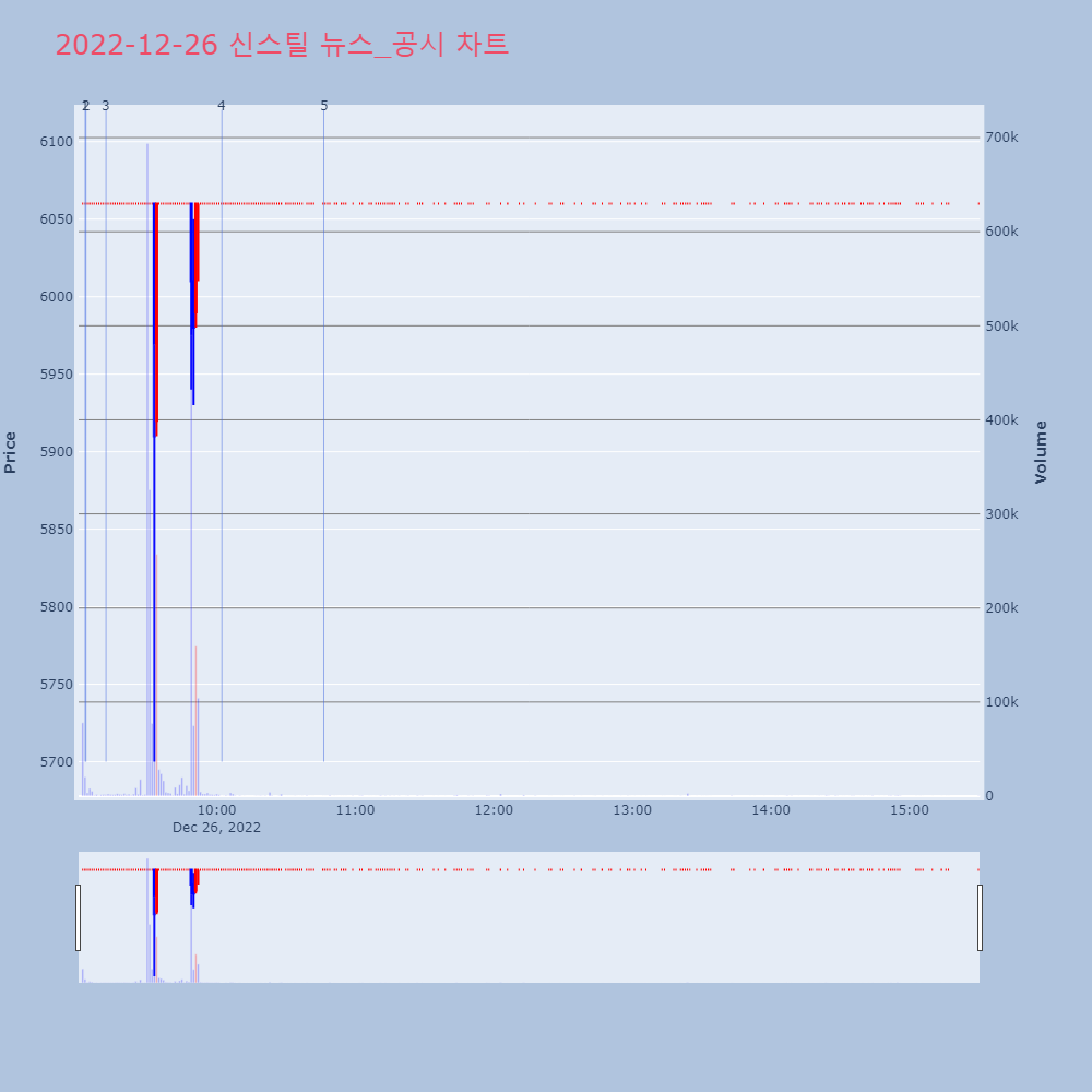 | 4 | [특징주] '스팩합병' 신스틸, 2거래일 연속 상한가 제목 : [특징주] '스팩합병' 신스틸, 2거래일 연속 | 인포스탁 | 신스틸 | 2022-12-26 10:02:15 |