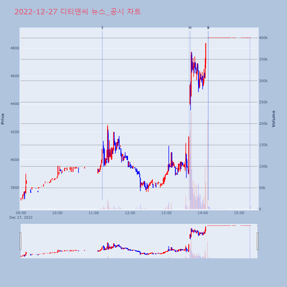 | 2 | 디티앤씨, +8.67% VI 발동디티앤씨가 VI가 발동했다. 전일 대비 8.67% 상승 | 조선경제 | 디티앤씨 | 2022-12-27 11:14:17 |