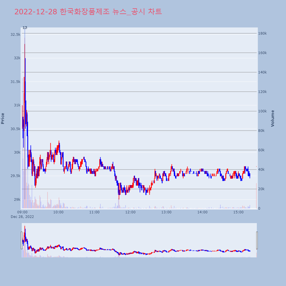 | 6 | 한국화장품제조(003350) 상한가, 한국화장품 +22.45%, 코리아나 +17.82%, 제목 : 한국화장품제조(003350)상한가, 한국화장품 | 인포스탁 | 한국화장품제조 | 2022-12-27 11:08:35 |