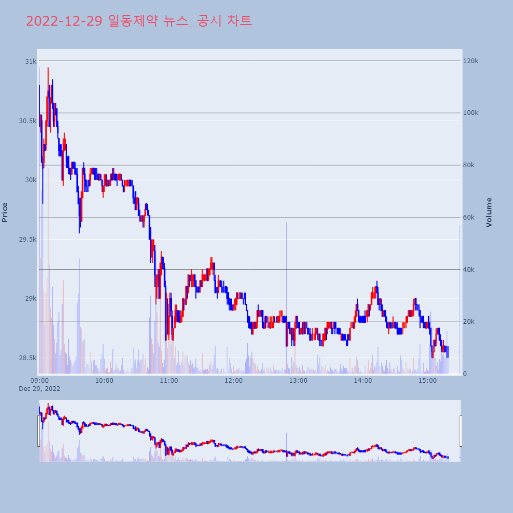 | 4 | [특징주] 일동제약, 24%대 급락...코로나19 치료제 긴급사용승인 불발 제목 : [특징주] 일동제약, 24%대 급락...코로나 | 인포스탁 | 일동제약 | 2022-12-28 14:21:18 |
