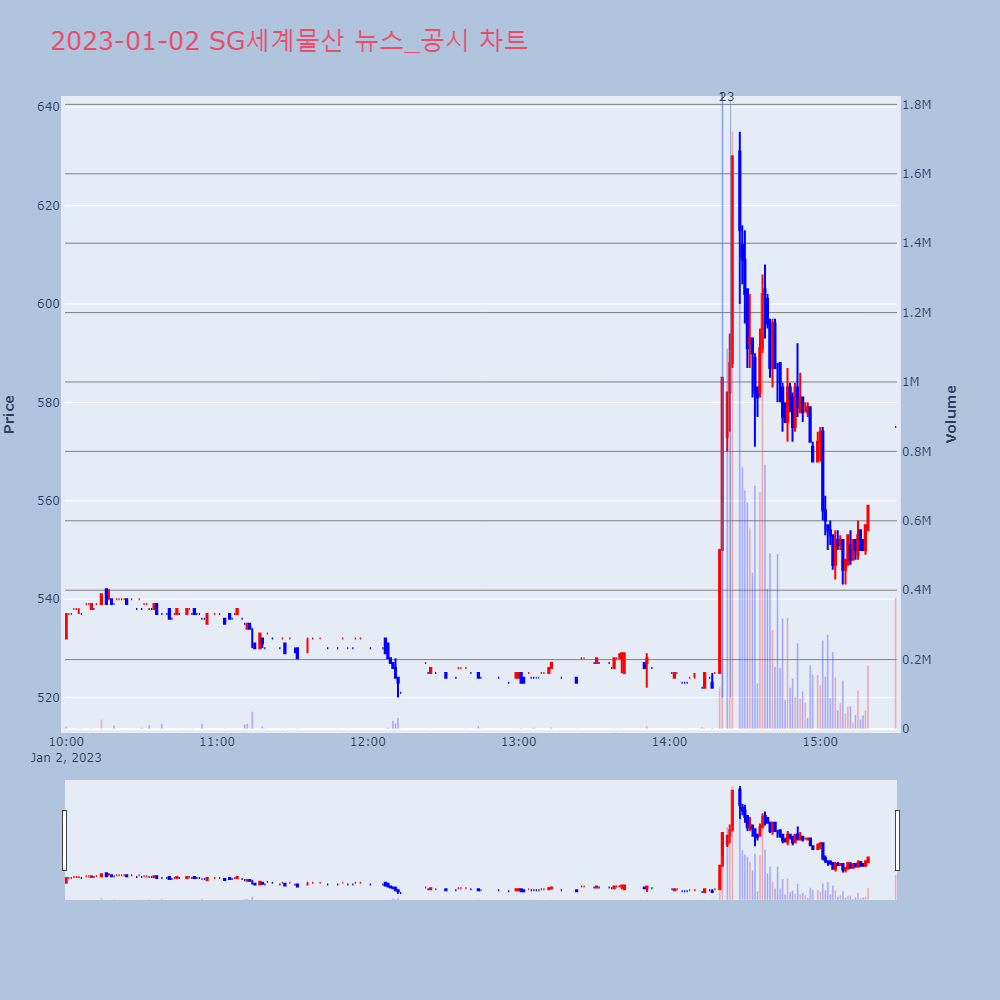 | 2 | SG세계물산, +9.55% VI 발동SG세계물산이 VI가 발동했다. 전일 대비 9.55% | 조선경제 | SG세계물산 | 2023-01-02 14:21:14 |