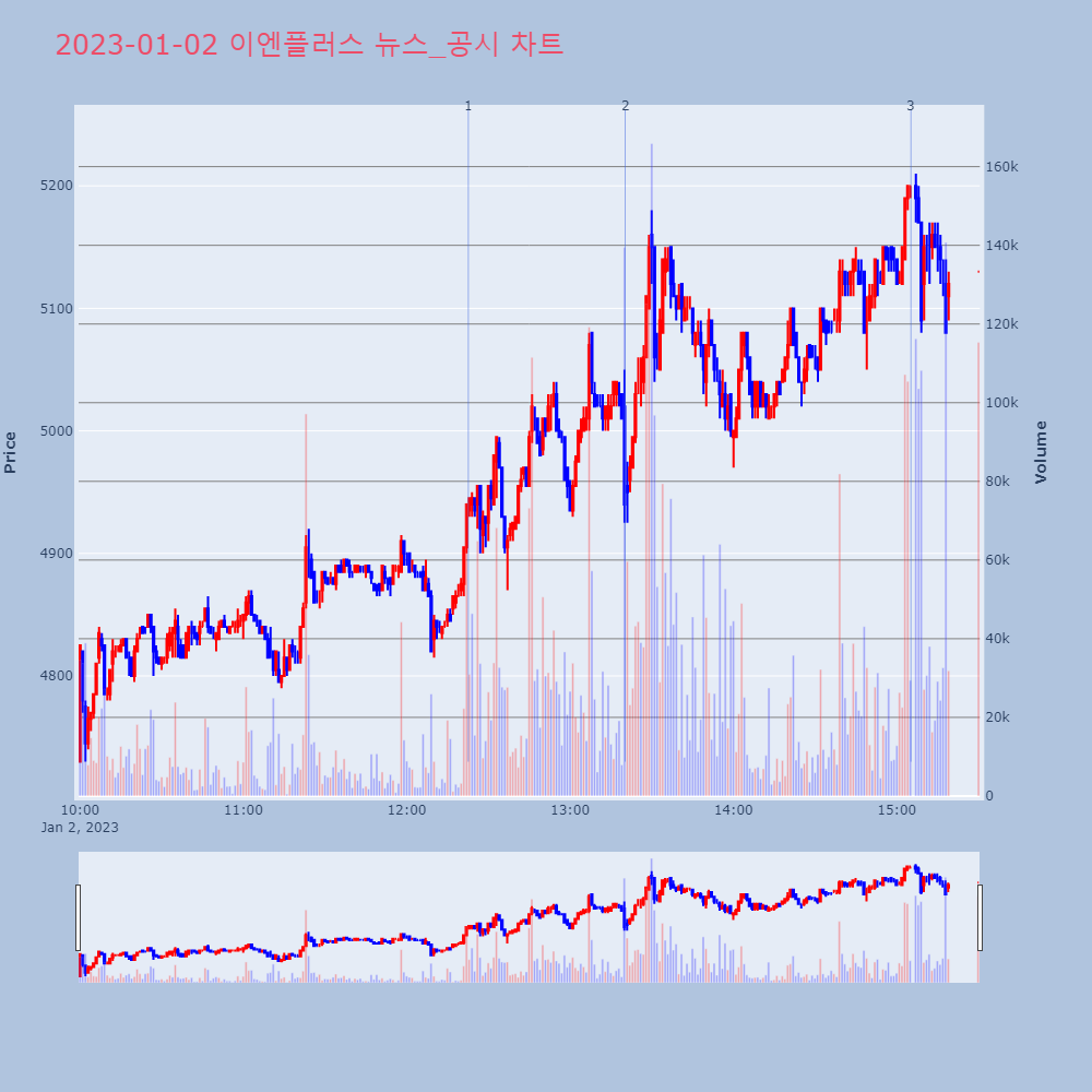 | 3 | 이엔플러스, +10.05% VI 발동이엔플러스가 VI가 발동했다. 전일 대비 10.05% | 조선경제 | 이엔플러스 | 2023-01-02 15:05:11 |
