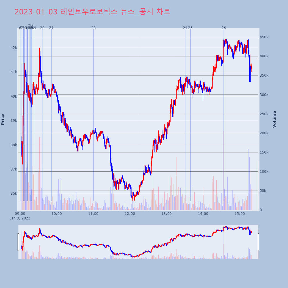 | 41 | [특징주] 레인보우로보틱스, 삼성전자 대상 유상증자 결정 소식에 15% 급등레인보우로보틱스가 삼성전자에 약 589억원 규모의 유상 | 조선경제 | 레인보우로보틱스 | 2023-01-03 09:07:35 |