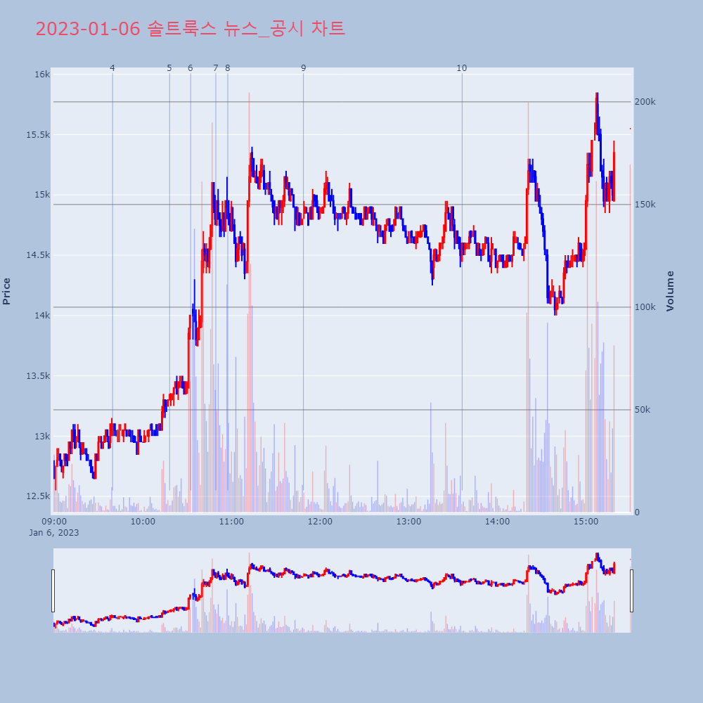 | 3 | 솔트룩스, -7.09% VI 발동솔트룩스가 VI가 발동했다. 전일 대비 7.09% 하락 | 조선경제 | 솔트룩스 | 2023-01-05 09:31:31 |