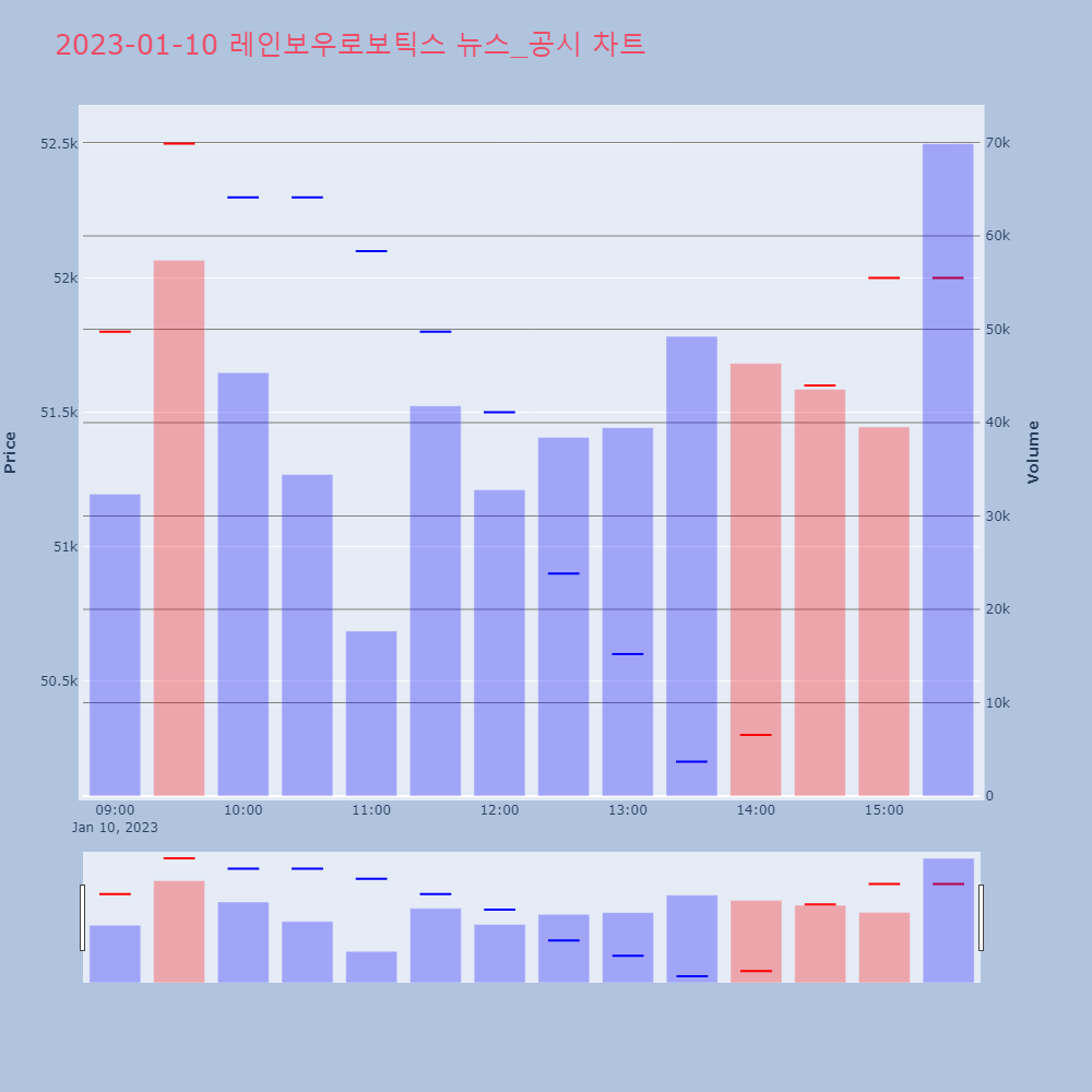 | 1 | [특징주]레인보우로보틱스, 삼성전자 러브콜에 5만원 돌파[이데일리 김인경 기자] 레인보우로보틱스(277810) | 이데일리 | 레인보우로보틱스 | 2023-01-09 09:08:41 |