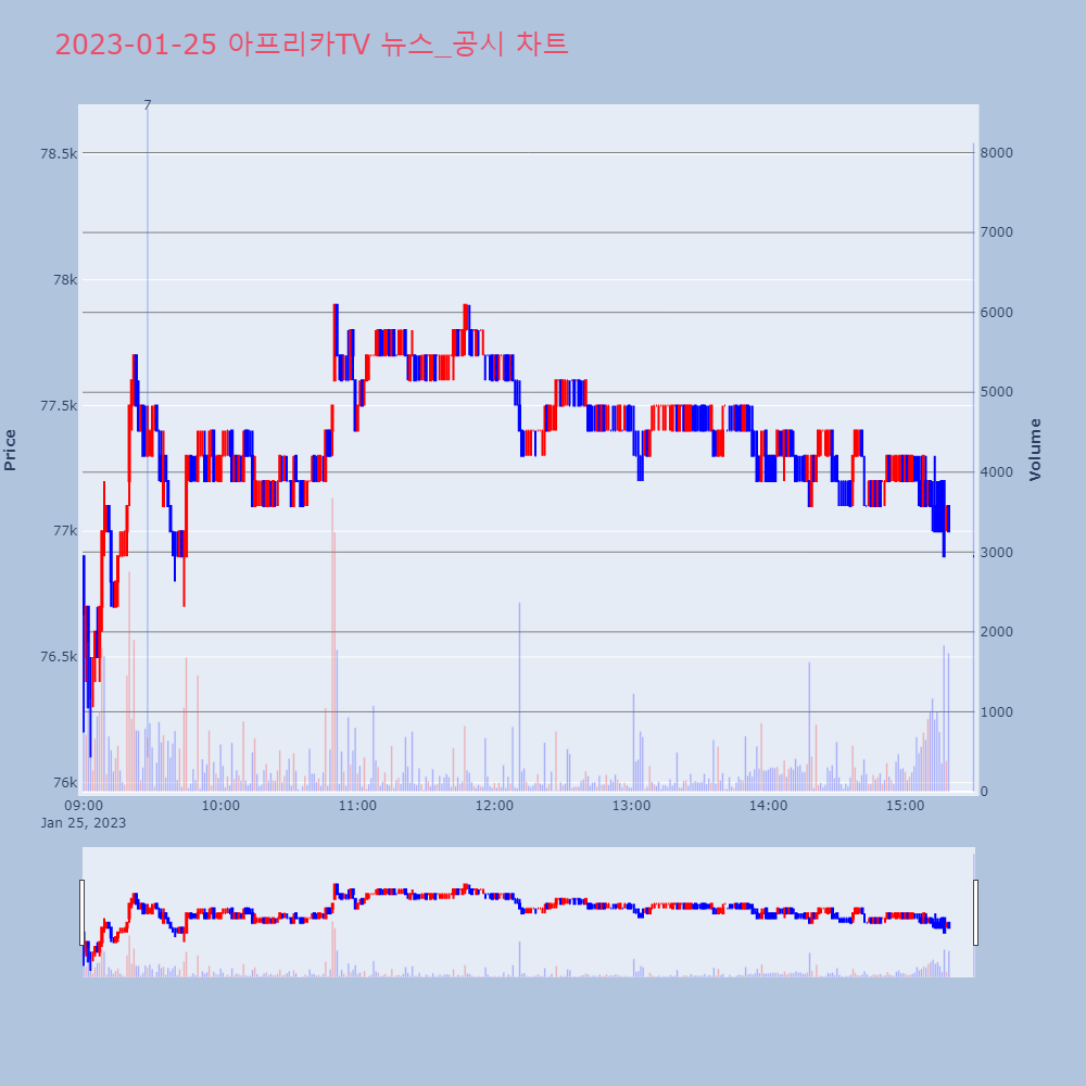 | 7 | [특징주]아프리카TV, 콘텐츠·유저 다양화 평가 속 오름세[이데일리 이정현 기자] 아프리카TV(067160)가 | 이데일리 | 아프리카TV | 2023-01-25 09:28:02 |