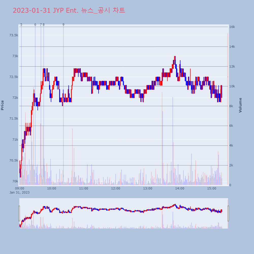 | 9 | [장중수급포착] JYP Ent., 외국인 10일 연속 순매수행진... 주가 +1.99% [서울=뉴스핌] 로보뉴스 = 31일 10시 15분 현재 | 뉴스핌 | JYP Ent. | 2023-01-31 10:22:06 |