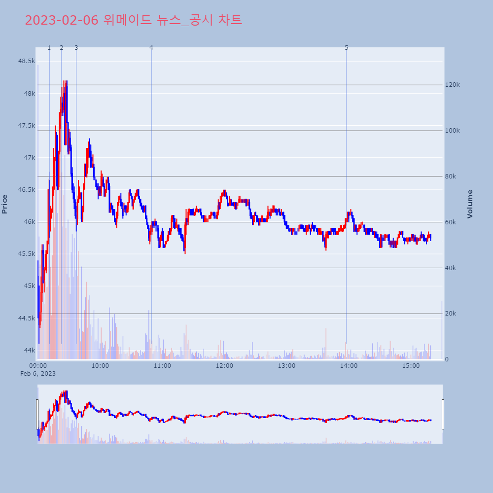 | 5 | [특징주] 위메이드, 미르M 글로벌 버전 흥행 소식에 3%대 강세 제목 : [특징주] 위메이드, 미르M 글로벌 버전 흥행 | 인포스탁 | 위메이드 | 2023-02-06 13:57:48 |