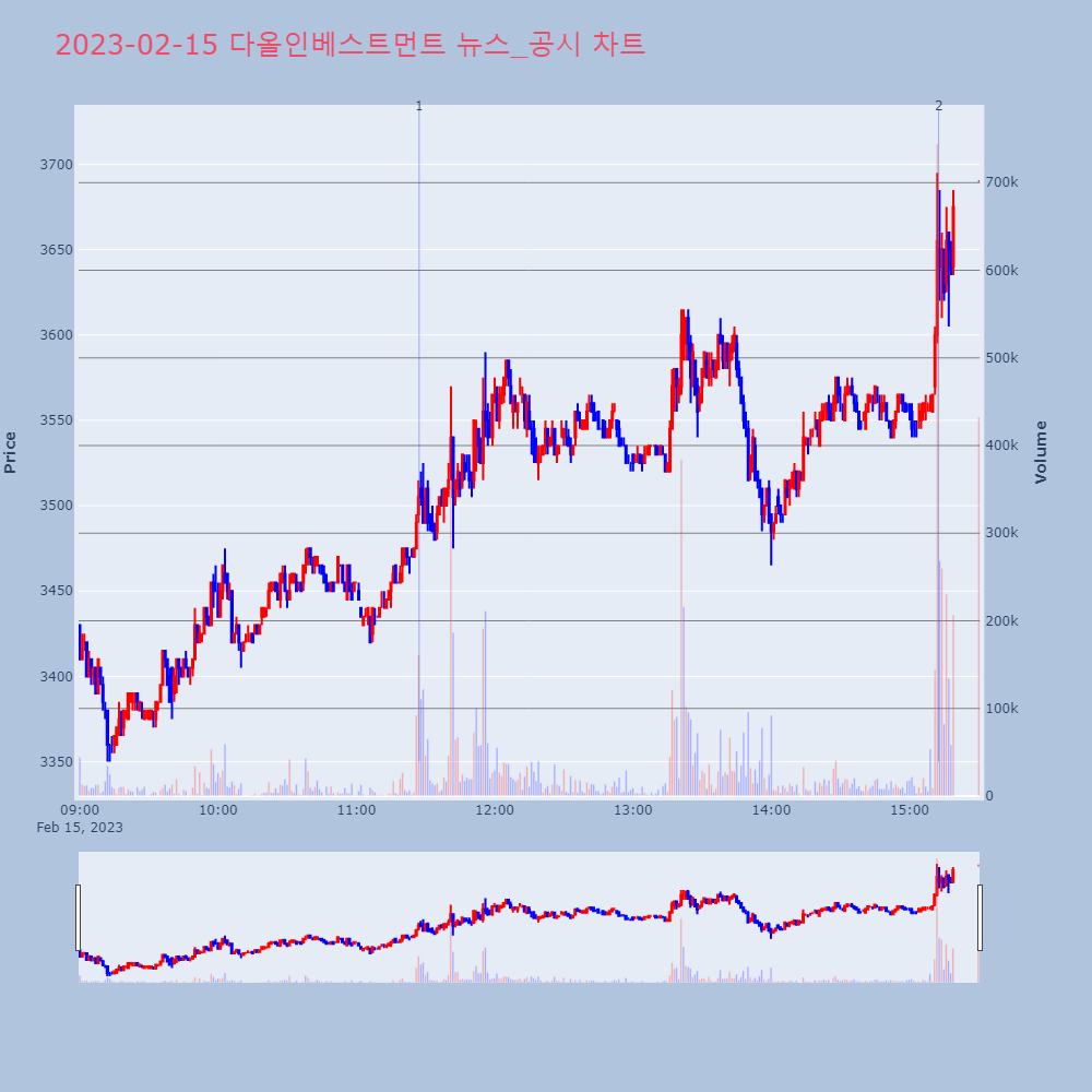 | 2 | 다올인베스트먼트, +8.41% 상승폭 확대다올인베스트먼트가 상승폭을 확대하고 있다. 전일 대비 | 조선경제 | 다올인베스트먼트 | 2023-02-15 15:12:37 |