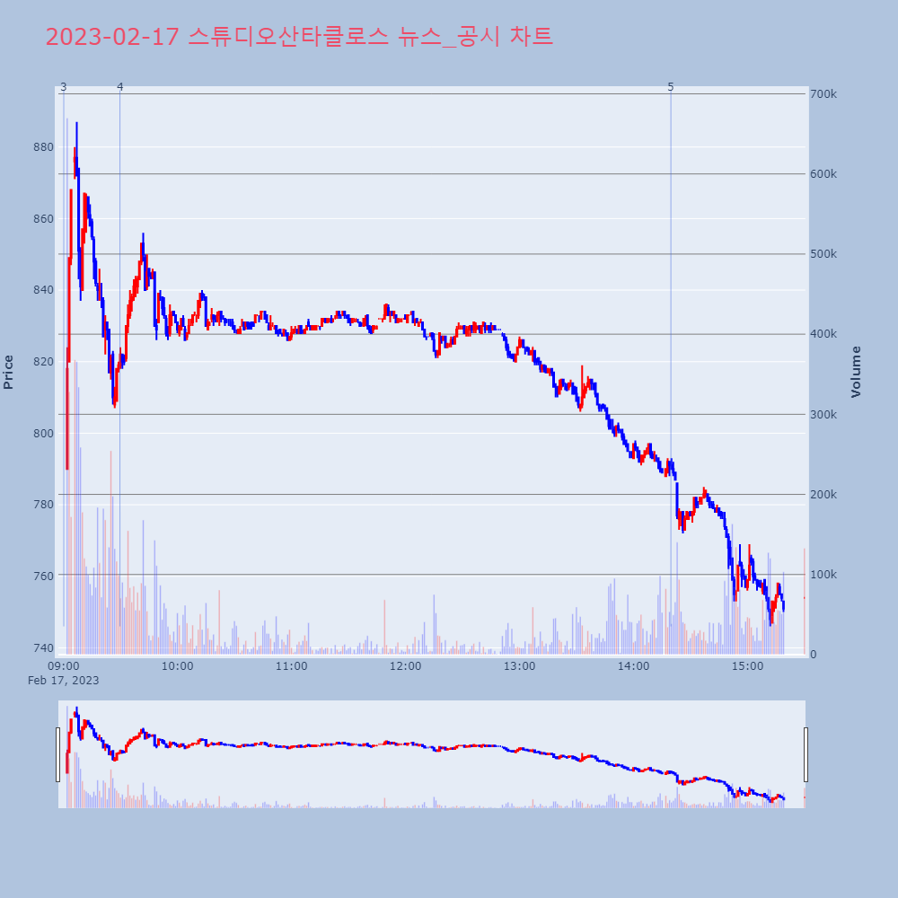 | 3 | 스튜디오산타클로스, 0.00% VI 발동스튜디오산타클로스가 VI가 발동했다. 현재 1,016원 | 조선경제 | 스튜디오산타클로스 | 2023-02-17 09:00:10 |