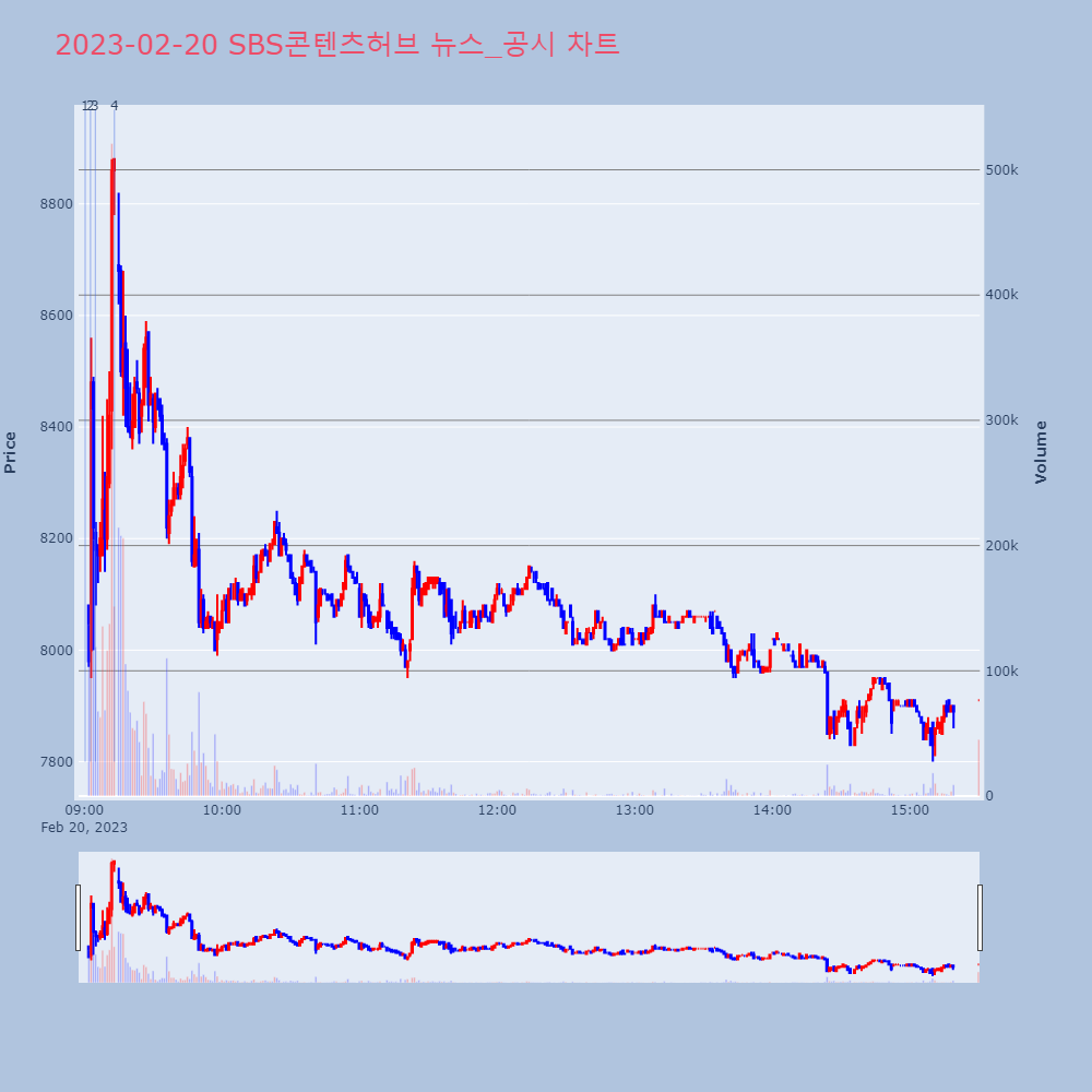 | 2 | SBS콘텐츠허브, 0.00% VI 발동SBS콘텐츠허브가 VI가 발동했다. 현재 7,530원에 | 조선경제 | SBS콘텐츠허브 | 2023-02-20 09:00:24 |