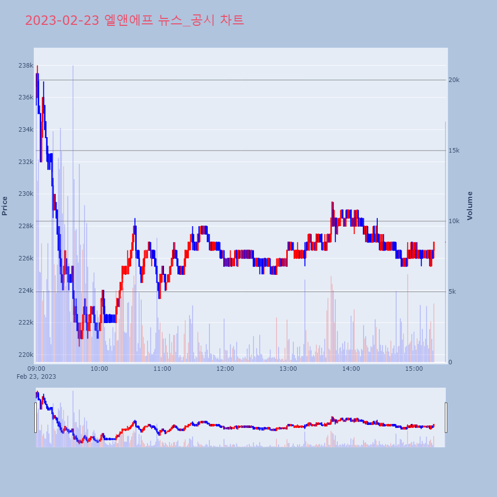 | 2 | 23일, 기관 코스닥에서 엘앤에프(-3.4%), 나노신소재(-6.01%) 등 순매도기관 투자자는 23일 코스닥에서 엘앤에프, 나노신소재 | 한경/증권 | 엘앤에프 | 2023-02-23 18:35:25 |