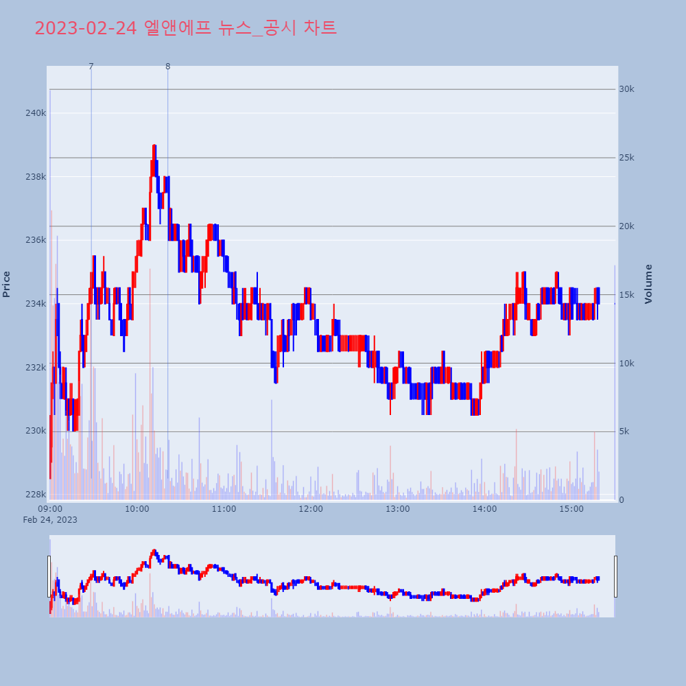 | 8 | [장중수급포착] 엘앤에프, 외국인/기관 동시 순매수… 주가 +4.41% [서울=뉴스핌] 로보뉴스 = 24일 10시 15분 현재 | 뉴스핌 | 엘앤에프 | 2023-02-24 10:21:20 |