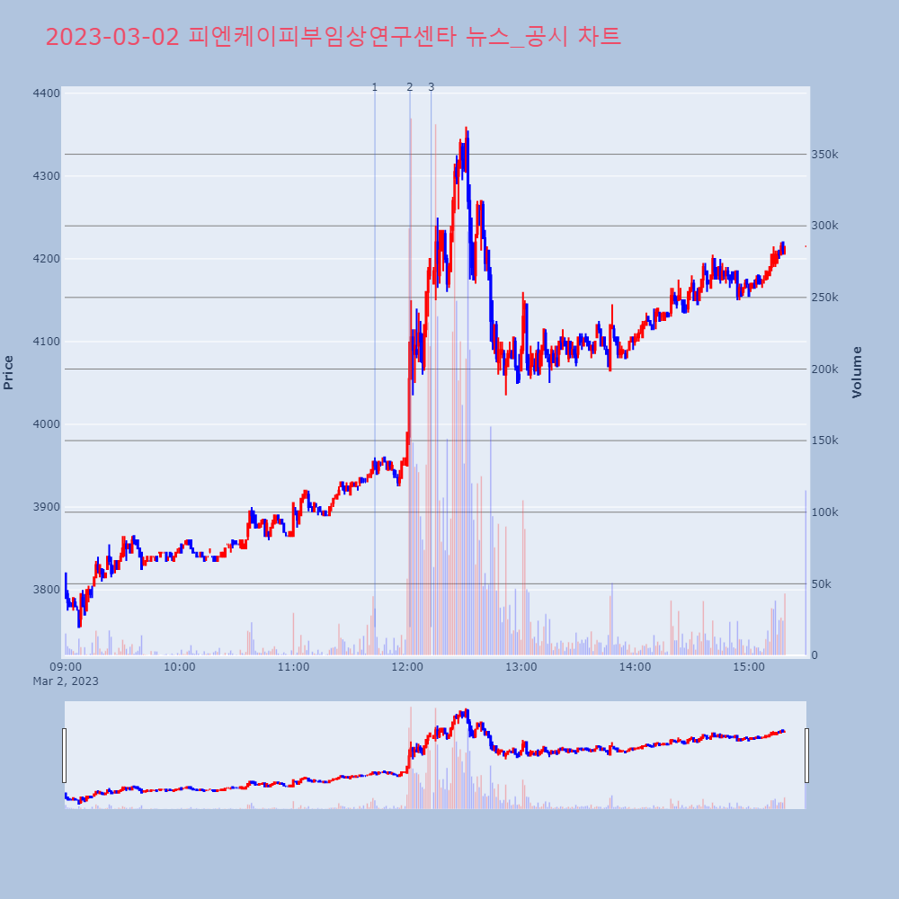 | 3 | 피엔케이피부임상연구센타, +10.54% VI 발동피엔케이피부임상연구센타가 VI가 발동했다. 전일 대비 | 조선경제 | 피엔케이피부임상연구센타 | 2023-03-02 12:12:38 |