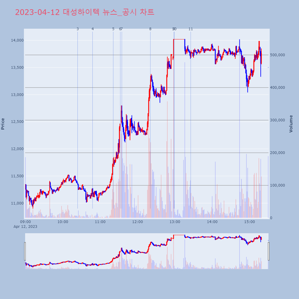| 3 | [장중수급포착] 대성하이텍, 기관 5일 연속 순매수행진... 주가 +5.75% [서울=뉴스핌] 로보뉴스 = 12일 10시 15분 현재 | 뉴스핌 | 대성하이텍 | 2023-04-12 10:23:50 |