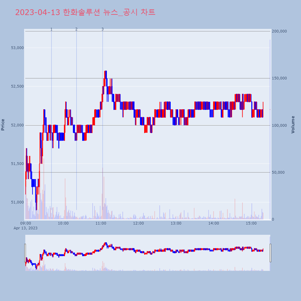 | 2 | [장중수급포착] 한화솔루션, 외국인/기관 동시 순매수… 주가 +2.17% [서울=뉴스핌] 로보뉴스 = 13일 10시 15분 현재 | 뉴스핌 | 한화솔루션 | 2023-04-13 10:21:16 |