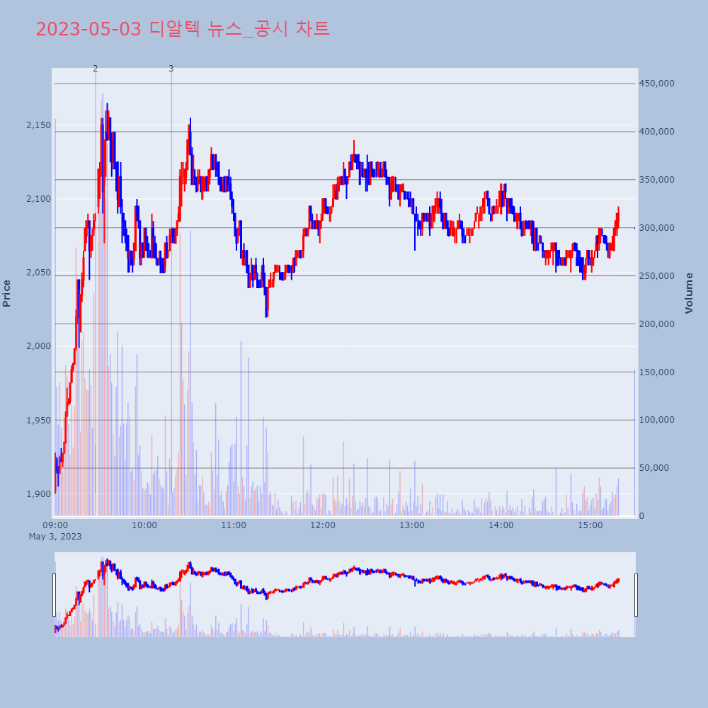 2 | 디알텍, +12.18% VI 발동디알텍이 VI가 발동했다. 전일 대비 12.18% 상승 | 조선경제 | 디알텍 | 2023-05-03 09:27:09 |
