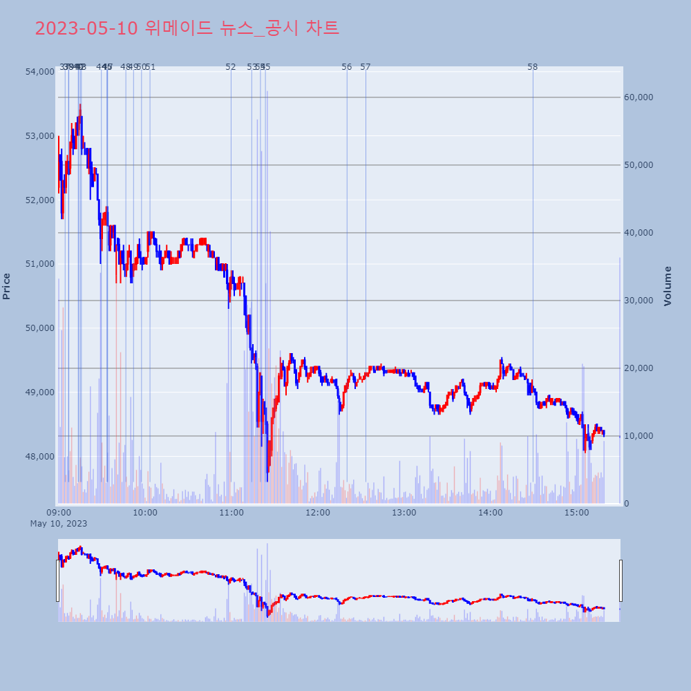 | 47 | [특징주] 위메이드, 적자 전환 소식에 3%대 약세장 초반 위메이드 주가가 3% 넘게 하락하고 있다. | 조선경제 | 위메이드 | 2023-05-10 09:33:59 |