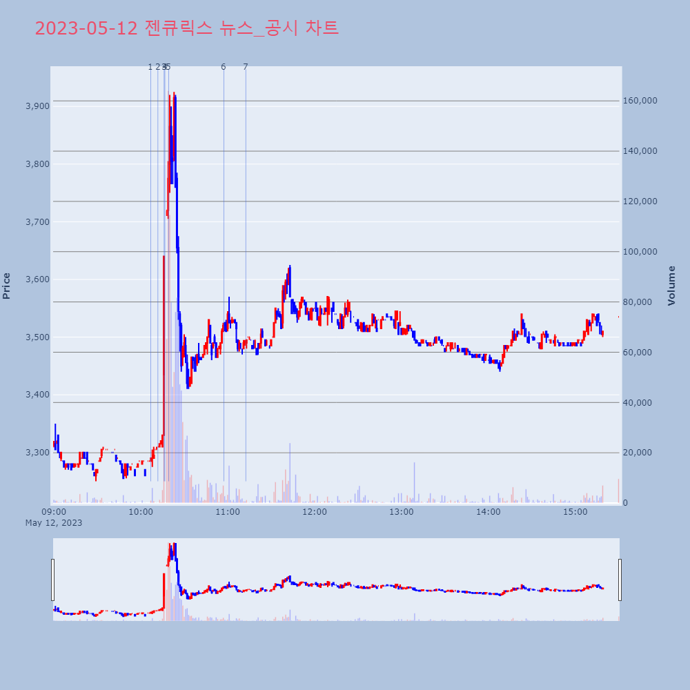 | 4 | 젠큐릭스, +7.25% VI 발동젠큐릭스가 VI가 발동했다. 전일 대비 7.25% 상승 | 조선경제 | 젠큐릭스 | 2023-05-12 10:16:40 |