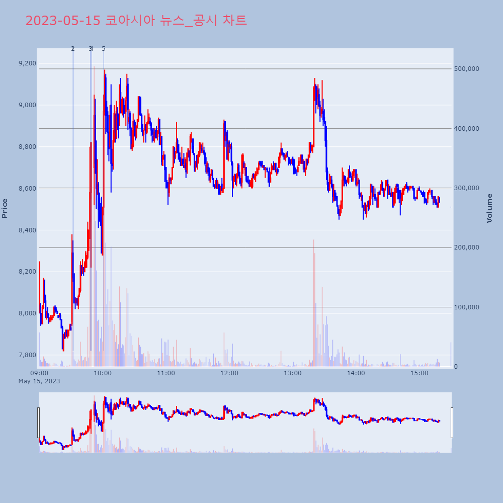 | 4 | 코아시아, +14.55% VI 발동코아시아가 VI가 발동했다. 전일 대비 14.55% 상 | 조선경제 | 코아시아 | 2023-05-15 09:49:43 |