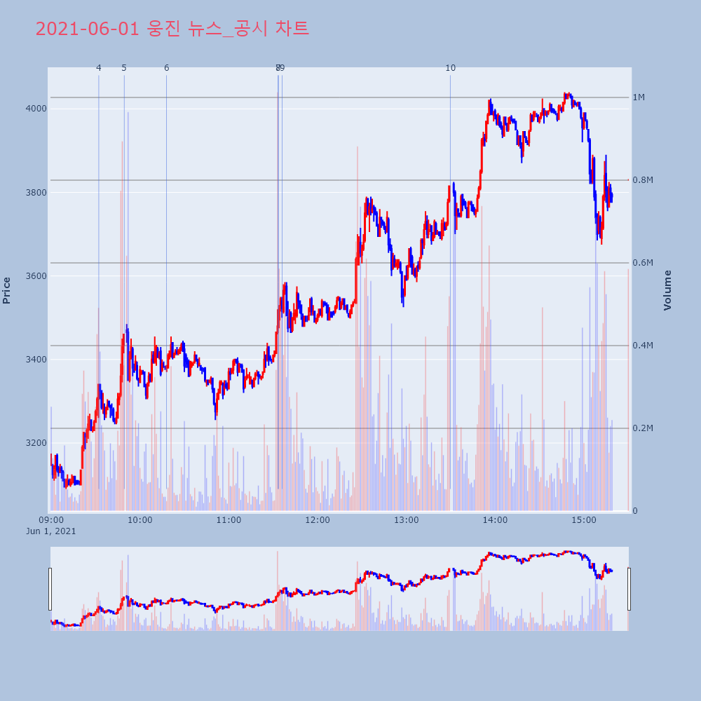 | 4 | 6 | [장중수급포착] 웅진, 외국인 63.73만 주 대량 순매수... 주가 +7.30% [서울=뉴스핌] 로보뉴스 = 01일 10시 15분 현재 | 뉴스핌 | 웅진 | 2021-06-01 10:17:55 |