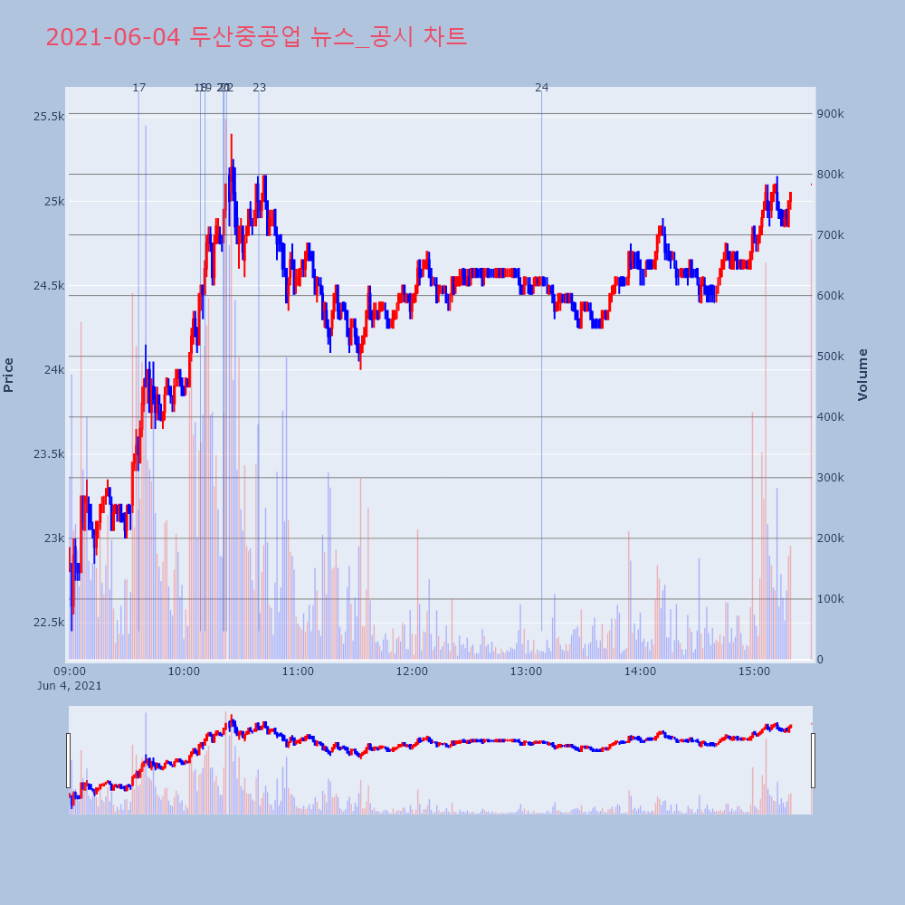 4 | 22 | 두산중공업, +10.33% VI 발동두산중공업(034020)이 VI가 발동했다. 전일 대비 | 조선경제 | 두산중공업 | 2021-06-04 10:22:26 |