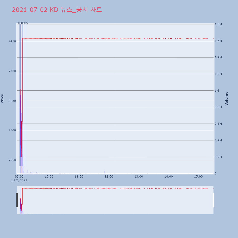 | 13 | 3 | KD, +12.71% VI 발동KD(044180)가 VI가 발동했다. 전일 대비 12 | 조선경제 | KD | 2021-07-01 09:10:04 |