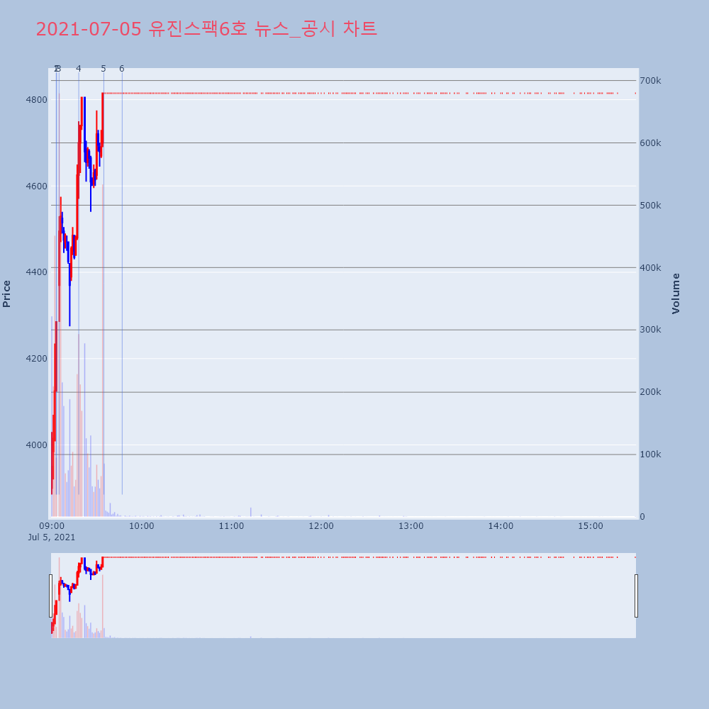 | 7 | 2 | 유진스팩5호, 0.00% VI 발동유진스팩5호(331380)가 VI가 발동했다. 현재 4 | 조선경제 | 유진스팩5호 | 2021-07-05 09:00:32 |