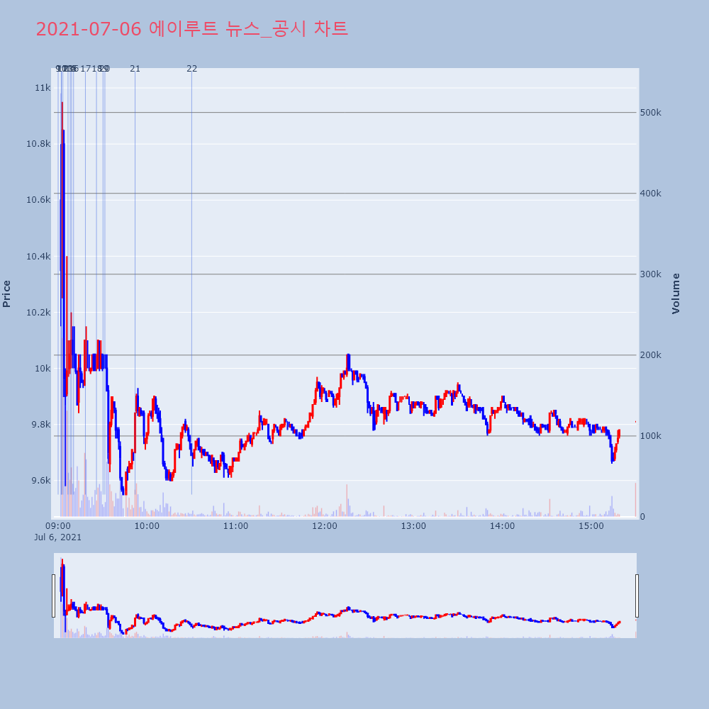 | 13 | 9 | 에이루트, 0.00% VI 발동에이루트(096690)가 VI가 발동했다. 현재 8,7 | 조선경제 | 에이루트 | 2021-07-06 09:00:06 |