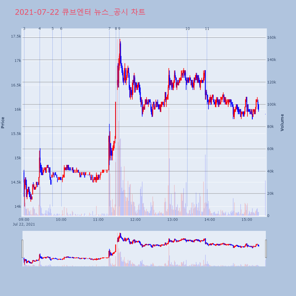 | 3 | 8 | 큐브엔터, +15.77% VI 발동큐브엔터(182360)가 VI가 발동했다. 전일 대비 | 조선경제 | 큐브엔터 | 2021-07-22 11:28:36 |
