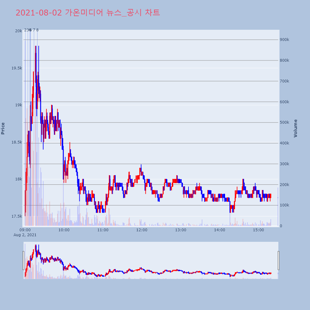 | 7 | 가온미디어, +9.89% VI 발동가온미디어(078890)가 VI가 발동했다. 전일 대비 | 조선경제 | 가온미디어 | 2021-08-02 09:13:46 |