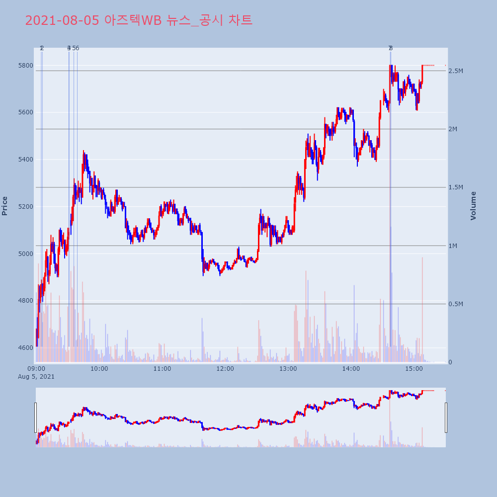 | 4 | 아즈텍WB, +14.00% VI 발동아즈텍WB(032080)가 VI가 발동했다. 전일 대비 | 조선경제 | 아즈텍WB | 2021-08-05 09:31:18 |