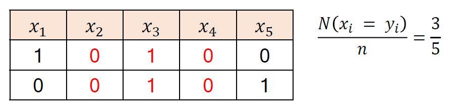 - 이진형 데이터에 적합한 유사도 척도로 전체 특징 중 일치하는 비율을 고려한다.