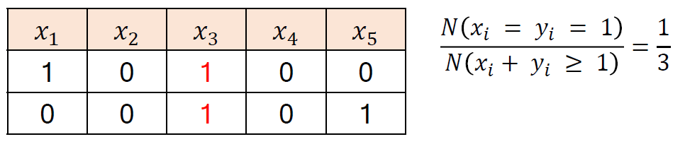 - 이진형 데이터에 적합한 유사도 척도로 둘 중 하나라도 1을 가지는 특징 중 일치하는 비율을 고려한다.