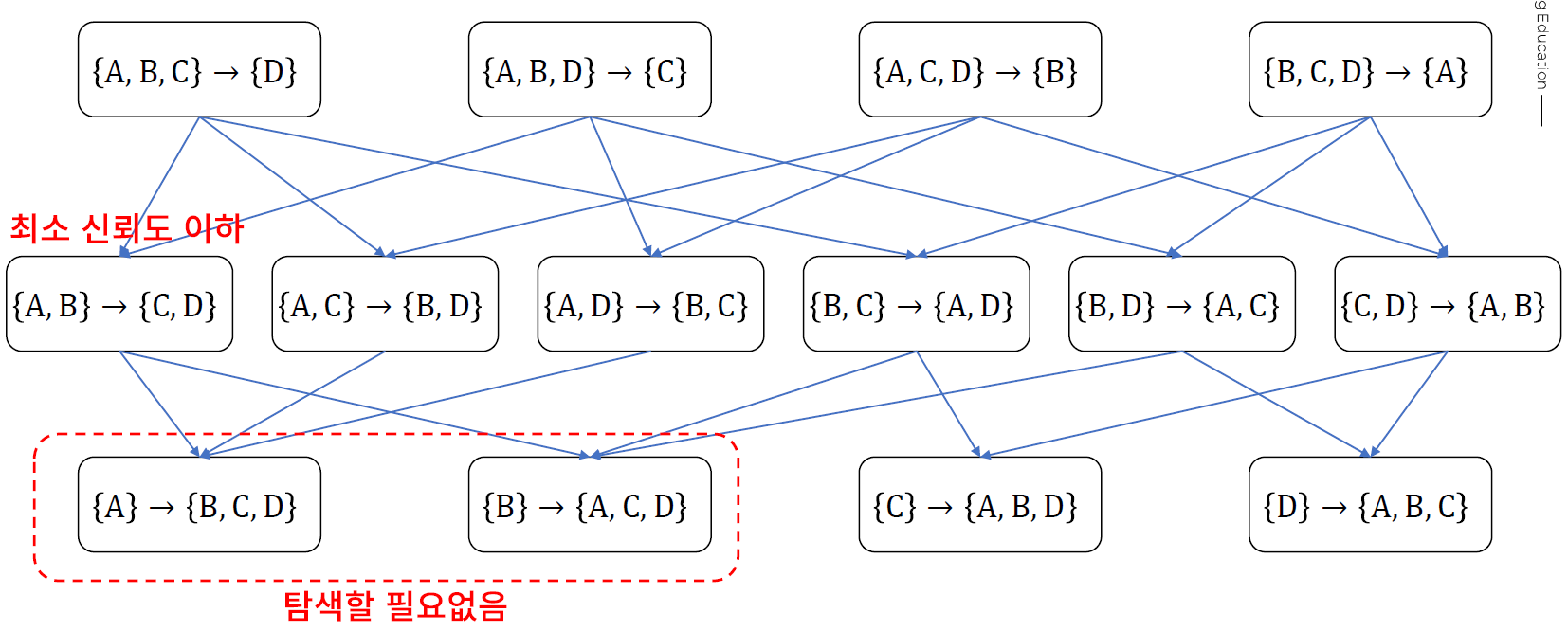 // 연관규칙으로 만들 수 있는 경우의 수가 굉장히 많은데 그걸 효율적으로 탐색하는 작업이 필요하다.