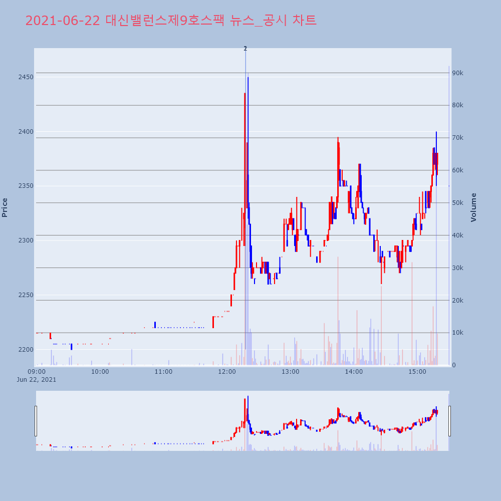| 1 | 1 | 대신밸런스제9호스팩, +9.46% VI 발동대신밸런스제9호스팩(369370)이 VI가 발동했다. | 조선경제 | 대신밸런스제9호스팩 | 2021-06-22 12:17:38 |
