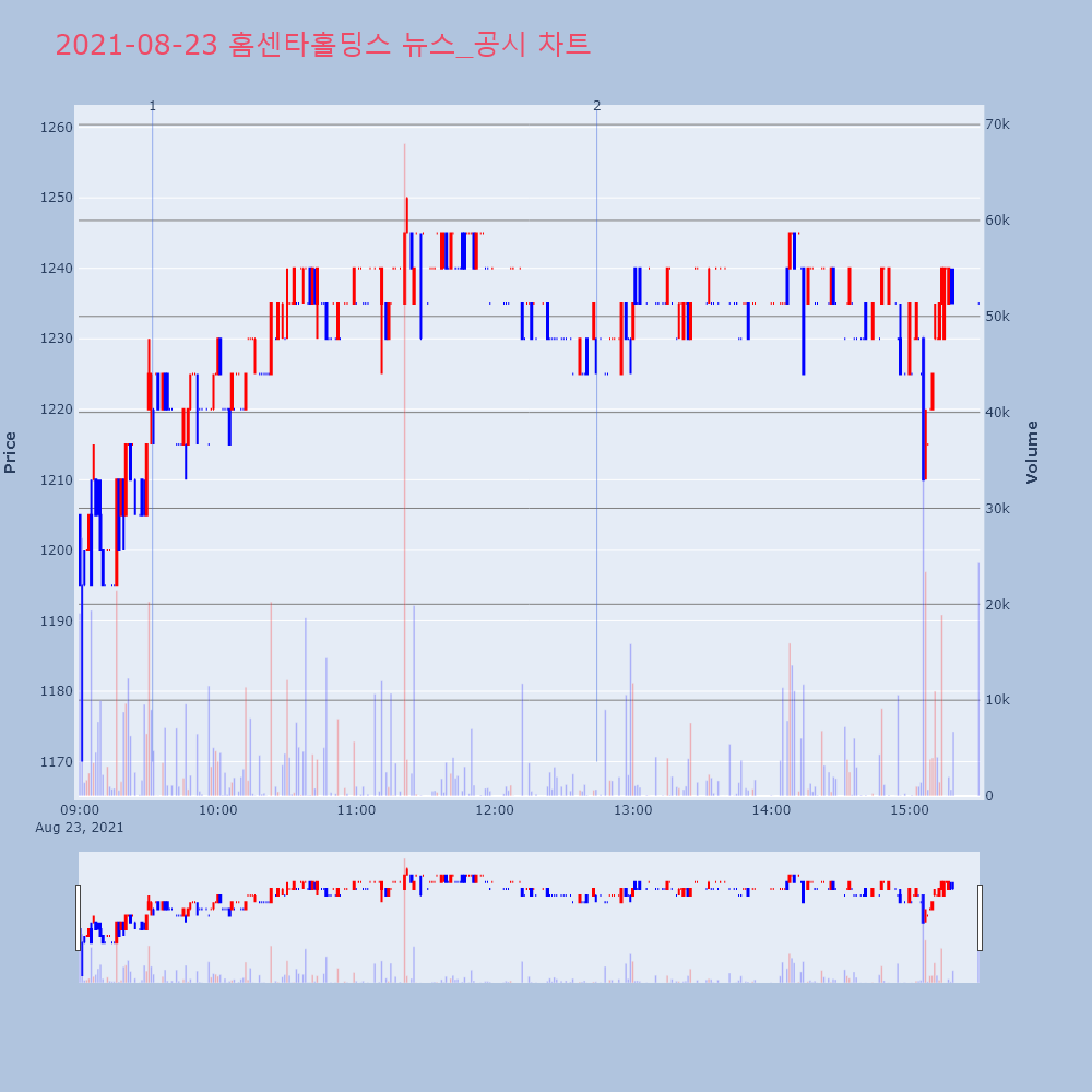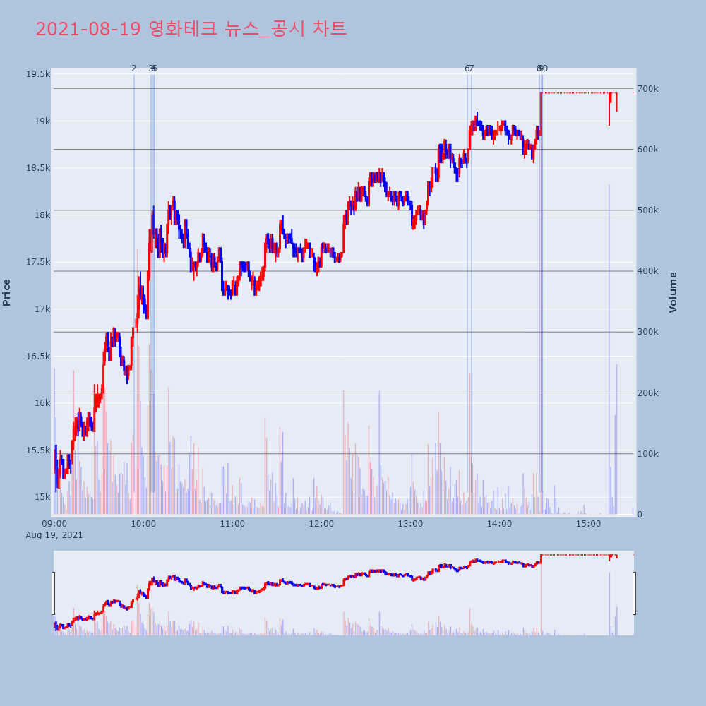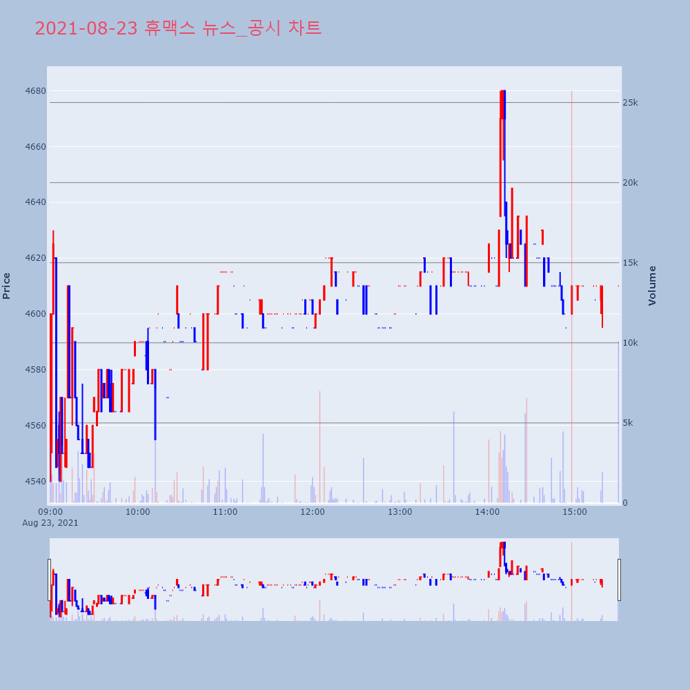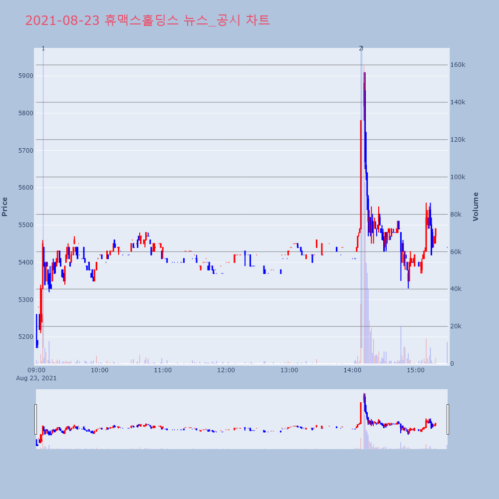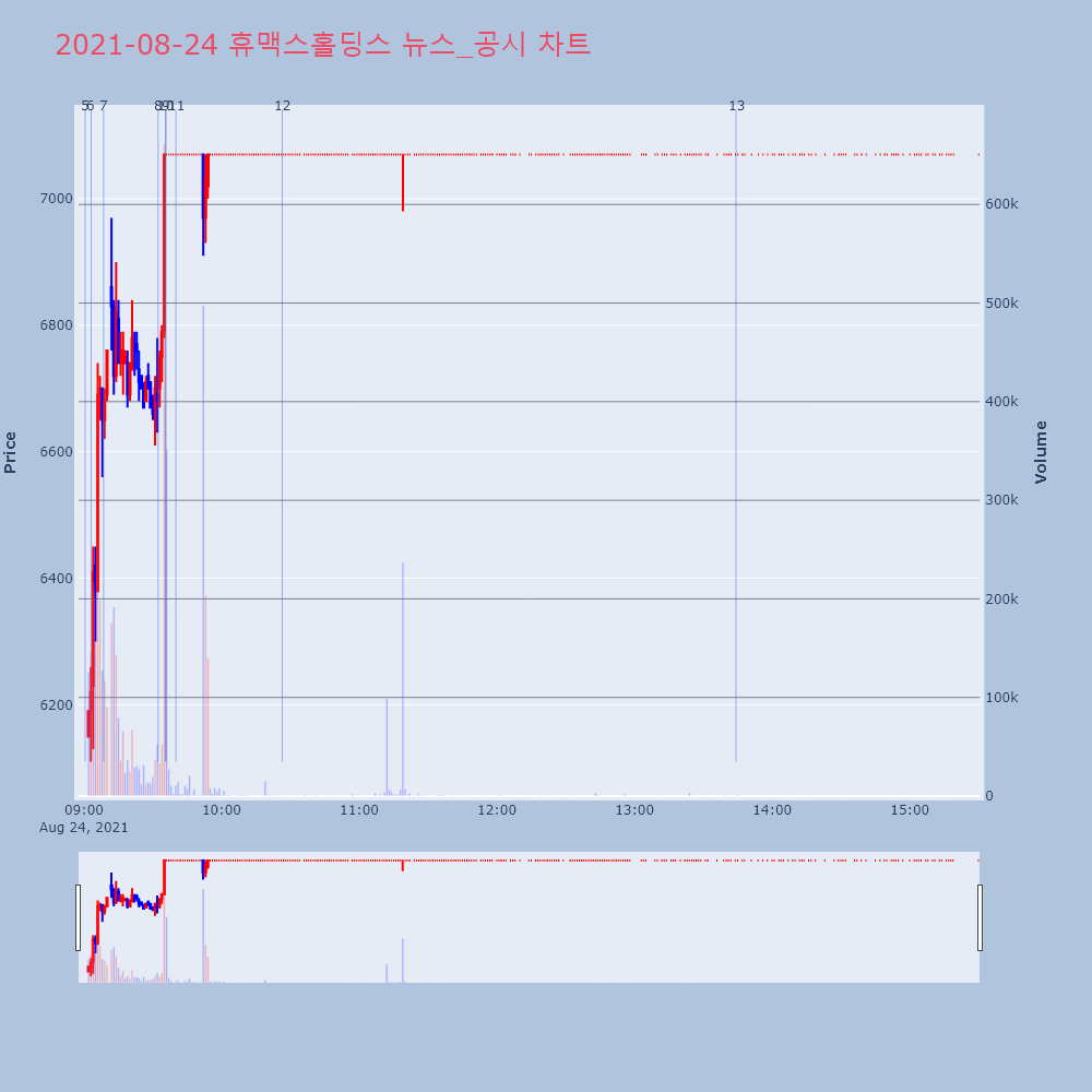 | 3 | 휴맥스홀딩스, +12.23% VI 발동휴맥스홀딩스(028080)가 VI가 발동했다. 전일 대 | 조선경제 | 휴맥스홀딩스 | 2021-08-23 14:08:58 |