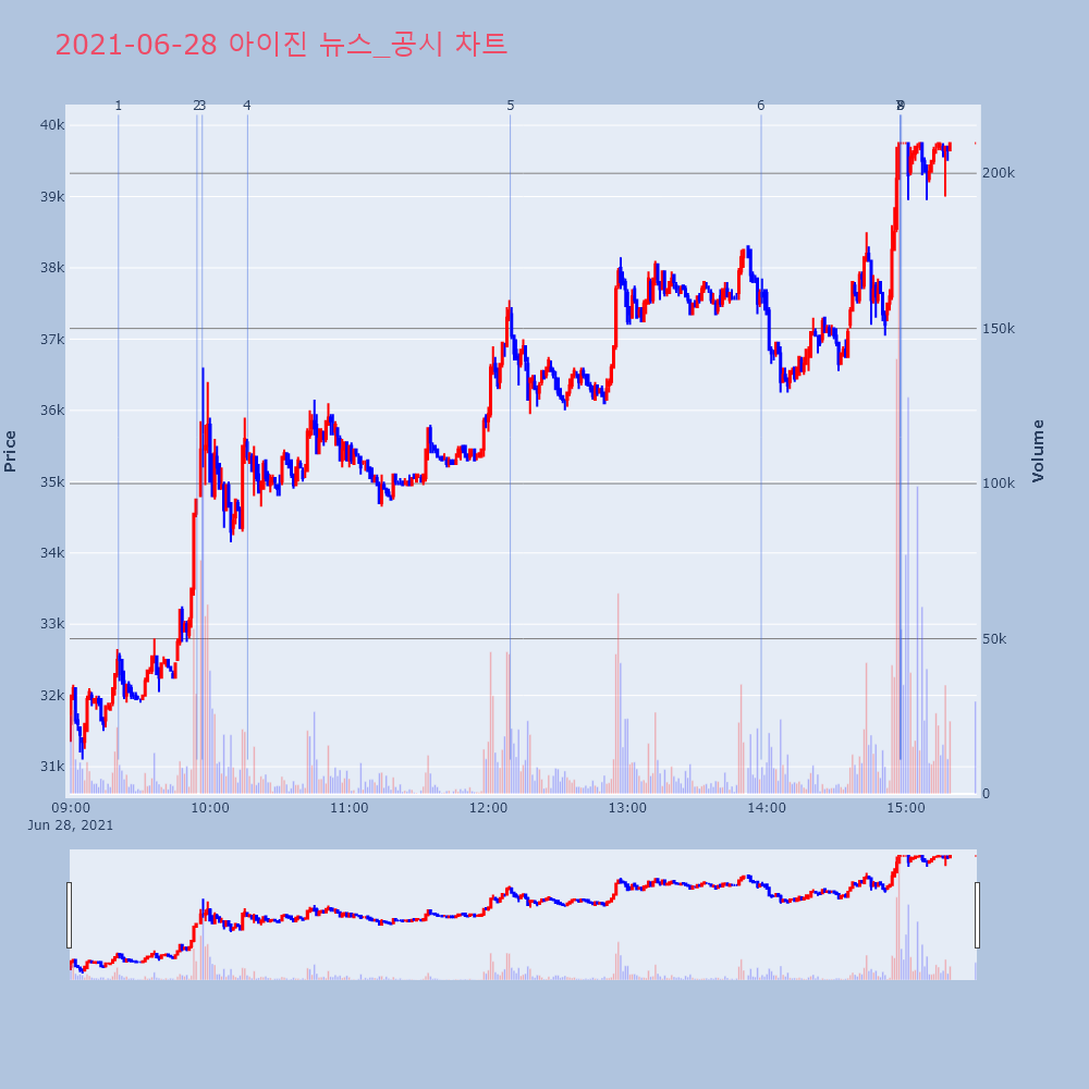 11 | 4 | 아이진, +11.07% VI 발동아이진(185490)이 VI가 발동했다. 전일 대비 1 | 조선경제 | 아이진 | 2021-06-29 09:11:52 |